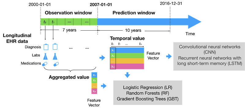 This study was among the early works that developed machine learning and deep learning models to predict 10-year CVD risk using longitudinal EHR and genetic data.